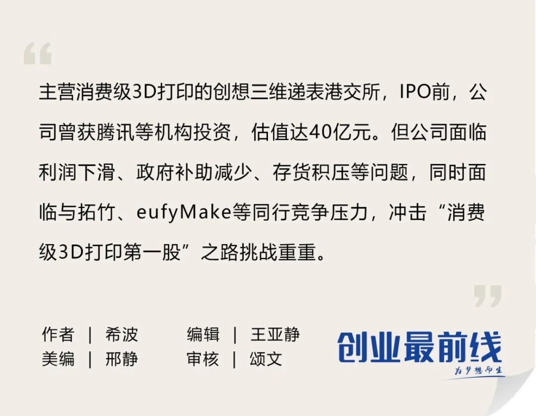 从行业前景来看,消费级3D打印行业无疑站在“全民创作”的风口上,但对于创想三维而言,利润下行压力、存货积压风险、政府补助减弱,再叠加拓竹科技、eufyMake等同行企业的强势入局,都让公司面临考验。