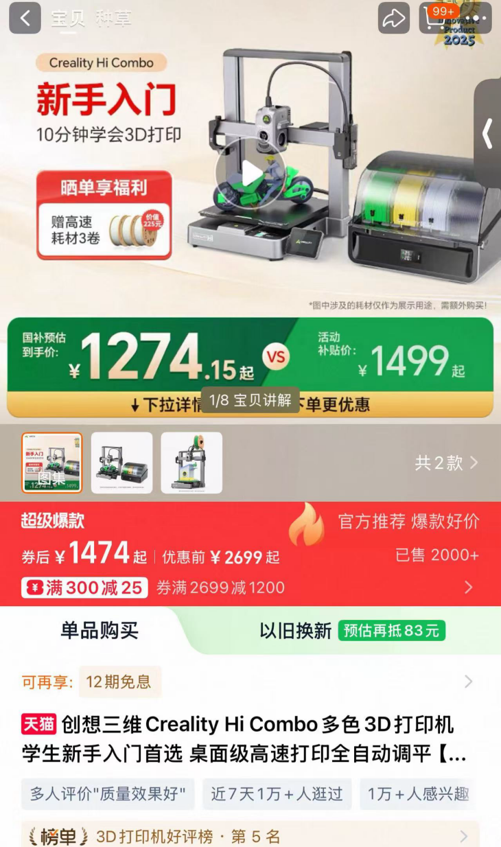 在拓竹天猫官方旗舰店中,销量最高的一款3D打印机拓竹A1已售4万+,而创想三维销量最高的打印机Creality Hi Combo仅售出2000+。